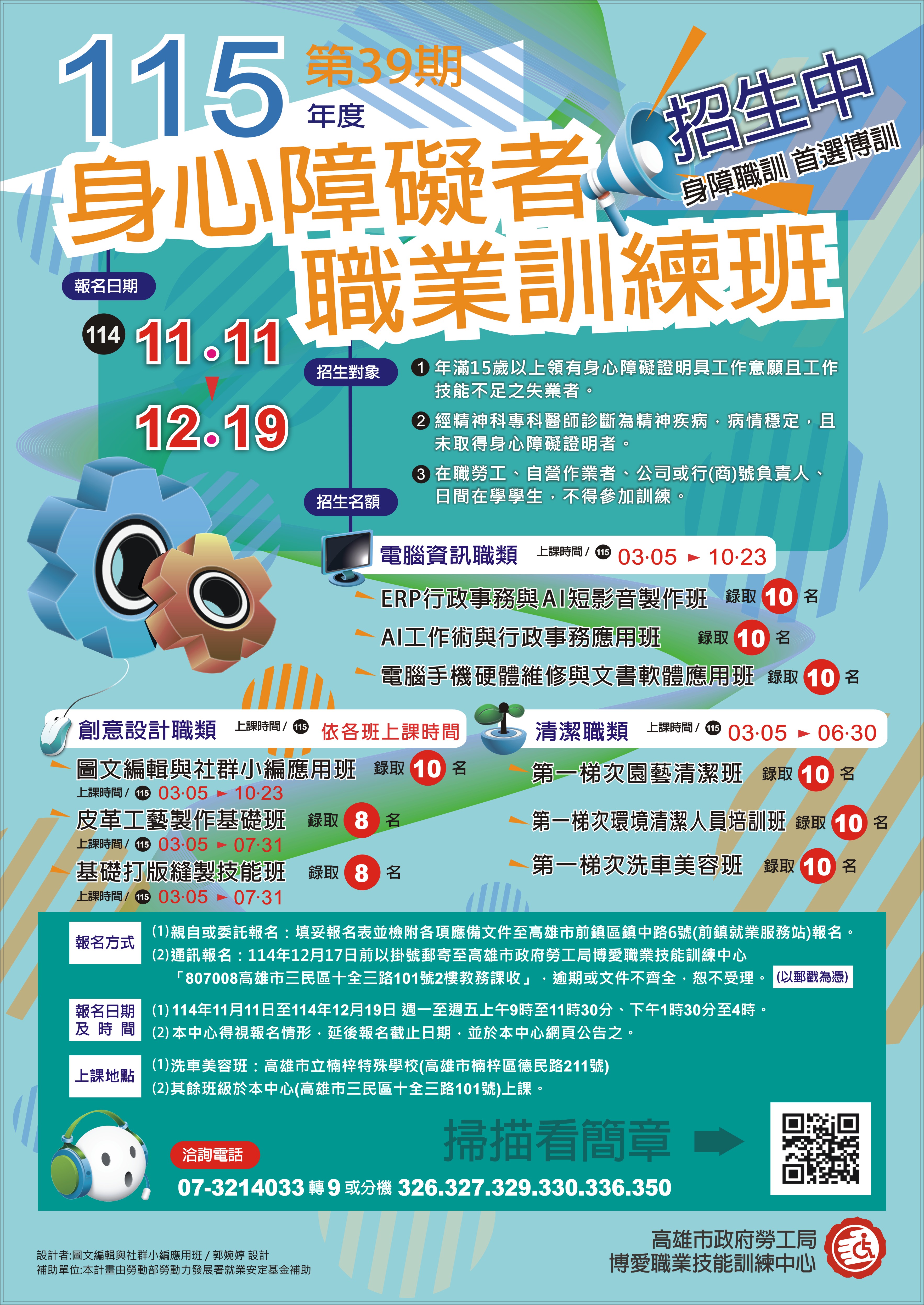 高雄市政府勞工局博愛職業技能訓練中心檢送博愛職業技能訓練中心115年度(第39期)自辦身心障礙者職業訓練班第一梯次招生